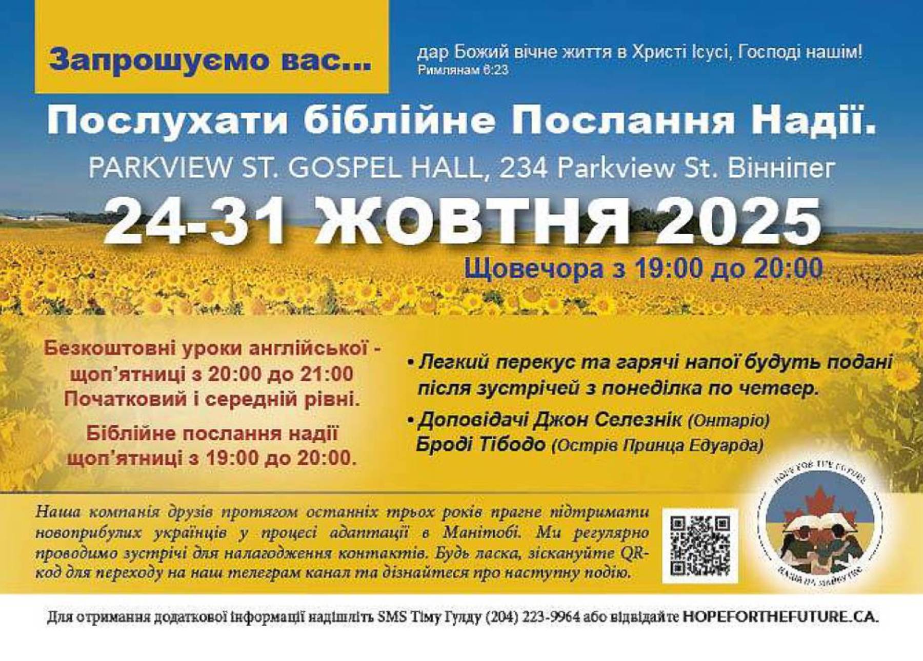 Ласкаво просимо до нашої спільноти. Ми група друзів-християн, які прагнуть допомогти новоприбулим українцям процвітати в Канаді, провінції Манітоба!